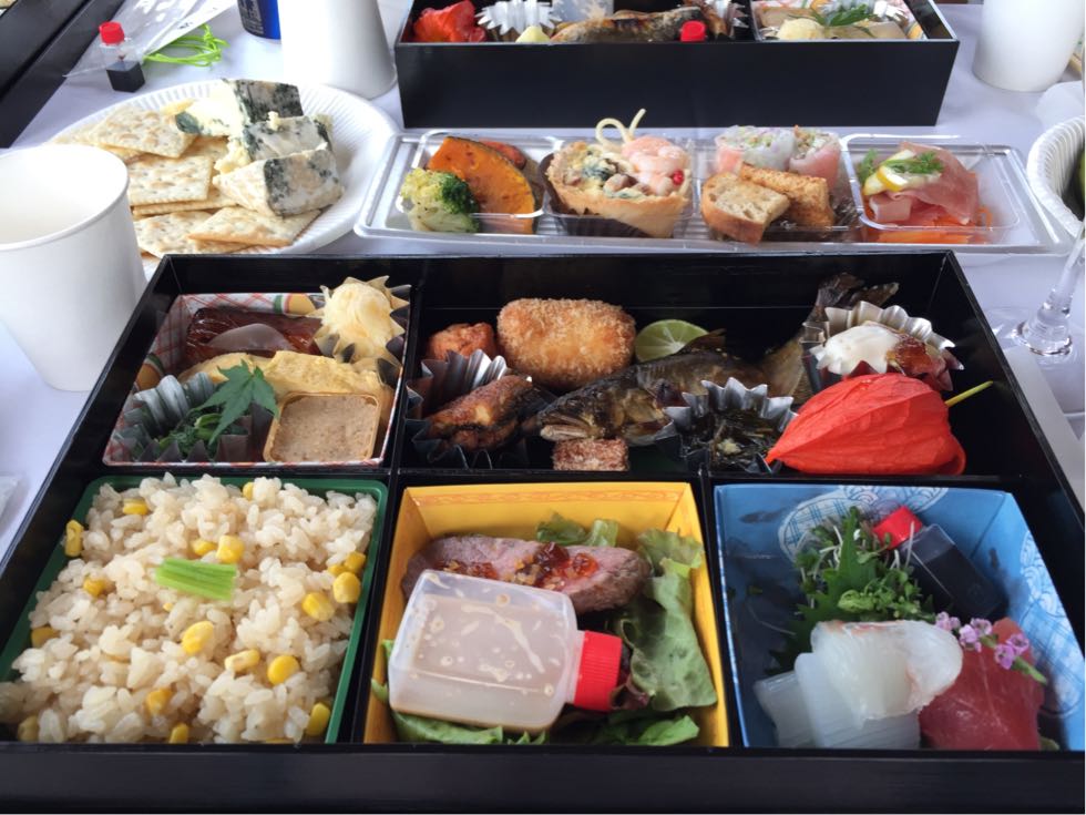 たかだ八祥さんのお弁当に、おつまみ色々。心配した船酔いもなかったので、すっかり宴会モードでした。