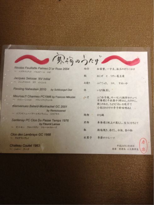 ワインリストを出すたびに、あれやこれやとダメ出しが出て? そのうち、オールブルゴーニュにする!などと、若女将のワガママいっぱい。。結局は、若女将好みのワインリストになっちゃいましたね〜と、苦笑されました。