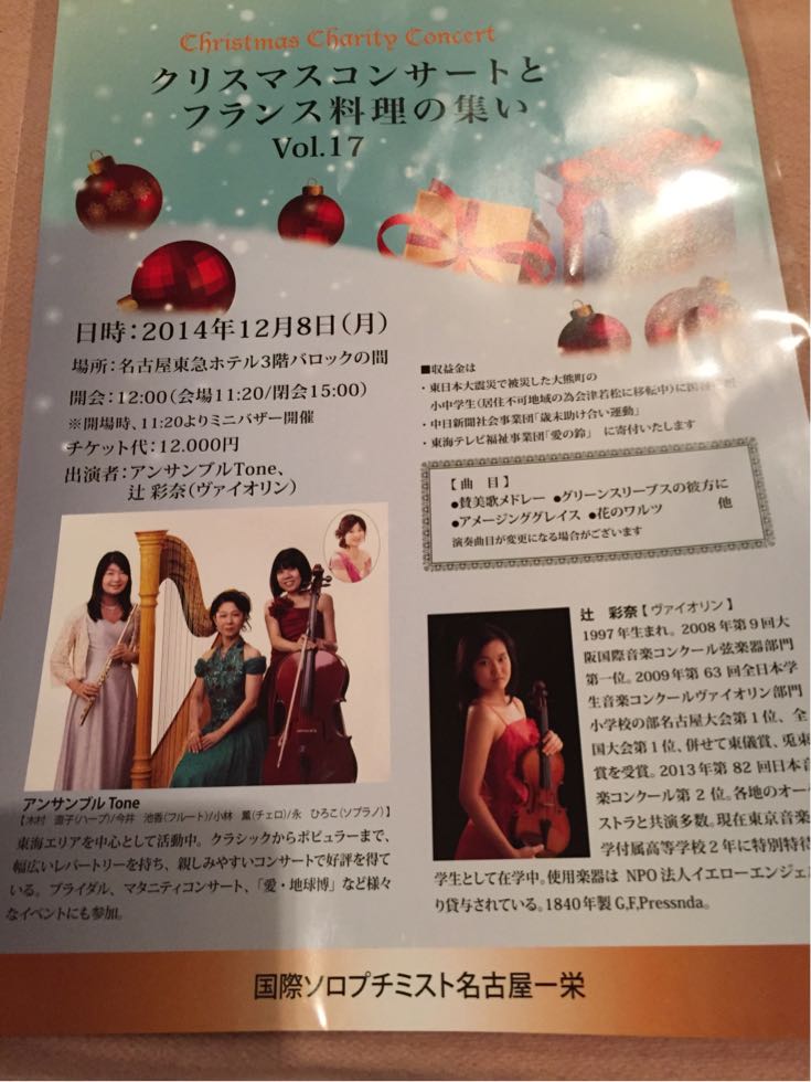 国際ソロプチミスト名古屋ー栄さまが主催する『クリスマスコンサートとフランス料理の集い』です。